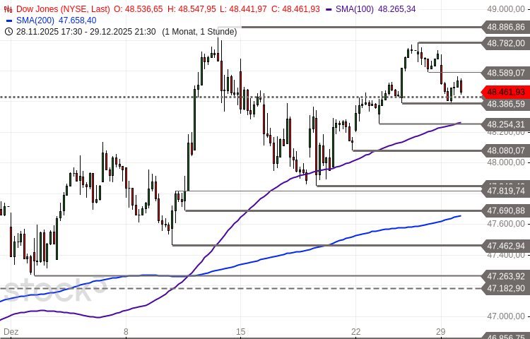 Der Dow Jones Industrial konnte bis zum 26. Dezember auf ein 9-Tages-Hoch bei 48.782 Punkten vorstoßen. Die darunter geformte Doji-Tageskerze leitete Gewinnmitnahmen ein, die die Notierung bis gestern auf ein 2-Tages-Tief bei 48.391 Punkten drückten.