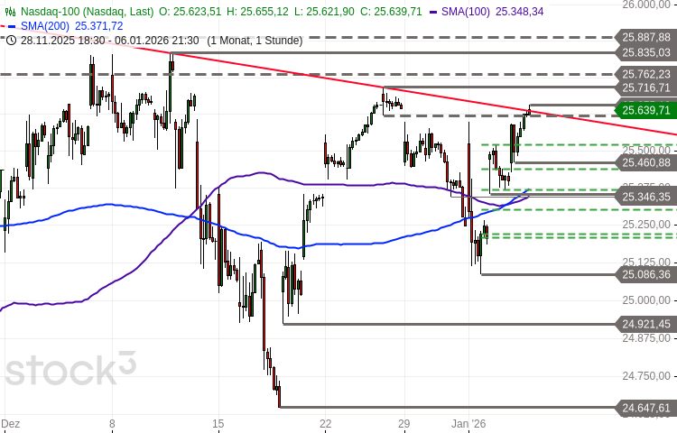 Der Nasdaq 100 dehnte seinen Schwächeanfall bis auf am 2. Januar gesehene 25.086 Punkte aus. Die dort gestartete Erholungsrally beförderte ihn bis zum gestrigen späten Handel auf ein 6-Tages-Hoch bei 25.655 Punkten.