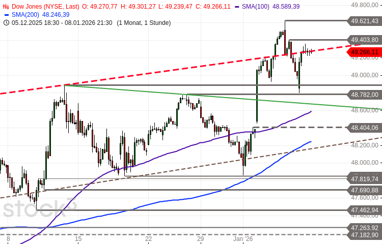 Der Dow Jones Industrial schraubte sich bis zum 7. Januar auf ein neues Rekordhoch bei 49.621 Punkten hinauf. Dort einsetzende Gewinnmitnahmen führten zu einem Pullback an die obere Begrenzung der am 5. Januar nach oben verlassenen Stauzone. Ausgehend vom im gestrigen frühen Handel verbuchten Tief bei 48.792 Punkten konnte sich der Index bis auf 49.358 Punkte erholen.