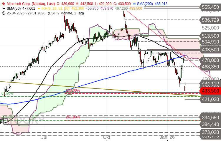 Die Microsoft-Aktie (WKN: 870747) hatte im Rahmen des langfristigen Aufwärtstrends im Juli bei 555,45 USD ein Allzeithoch markiert. Die nachfolgende Ausbildung einer zweiten Kursspitze knapp unterhalb der Bestmarke im Oktober leitete einen deutlichen Abverkauf ein. Nach einem zwischenzeitlichen mehrwöchigen Stabilisierungsversuch im Dunstkreis der 200-Tage-Linie kam es ab Mitte Januar zu einem signifikanten Unterschreiten dieser Durchschnittslinie. Es folgte ein mehrtägiger Pullback und im gestrigen Handel schließlich eine neue von extrem hohem Volumen begleitete Verkaufswelle (-10,00 %) in Reaktion auf die Veröffentlichung der Quartalszahlen. Dabei erreichte das Papier das analytische Mindestkurziel aus dem Doppeltop und verzeichnete ein 9-Monats-Tief bei 421,02 USD. Am dort befindlichen Ziel- und Unterstützungsbündel kam es im Tagesverlauf zu einer Erholung. Die Tageskerze signalisiert mit einer ausgeprägten Lunte Kaufinteresse auf dem erreichten Kursniveau. Eine anstehende Stabilisierung oder technische Erholung würde daher nicht überraschen. Eine erste Bestätigung für eine mögliche deutlichere Rally wäre in einem Tagesschluss oberhalb der nächsten Widerstandszone 438,68-444,11 USD zu sehen. Im Erfolgsfall wären Kursavancen in Richtung 452/455 USD und eventuell 466-478 USD vorstellbar. Erst mit einem nachhaltigen Anstieg über die Barriere bei derzeit 478-495 USD entstünde ein Signal für eine Machtübernahme durch die Bullen im übergeordneten Zeitfenster. Ein signifikanter Tagesschluss unterhalb des aktuellen Supportclusters bei 421-431 USD würde derweil ein bearishes Anschlusssignal liefern. In diesem Fall müsste eine unmittelbare Ausdehnung des mittelfristigen Abwärtstrends in Richtung 390-405 USD eingeplant werden.