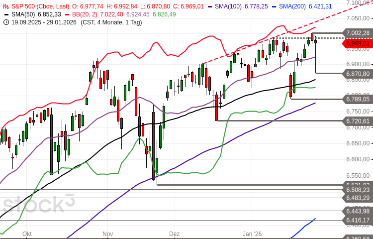 Der S&P 500 vollzog ausgehend vom am Mittwoch bei 7.003 Punkten markierten Rekordhoch einen dynamischen dreiwelligen Rücksetzer bis auf ein gestern bei 6.871 Punkten erreichtes 6-Tages-Tief. Dort vorhandenes Kaufinteresse beförderte den Index schwungvoll bis auf einen Schlusskurs bei 6.969 Punkten.